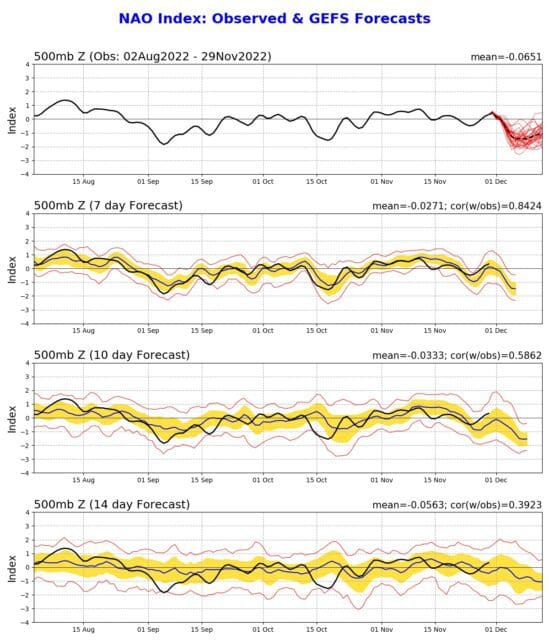 Obr. 1 Atlantik se odmlčí a inverze zavládne. Předpověď NAO indexu na počátek prosince 2022, zdroj: noaa.gov