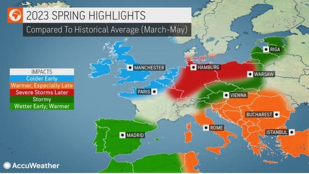 Obr. 1 Předpověď převažujícího význačného počasí v Evropě během jarních měsíců 2023, možná bude hodně bouřek, zdroj: accuweather.com