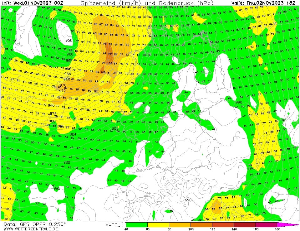 Obr. 5 Rozložení tlaku vzduchu a nárazy větru v centru Evropy na 2.11.2023 19SEČ, zdroj: wetterzentrale.de