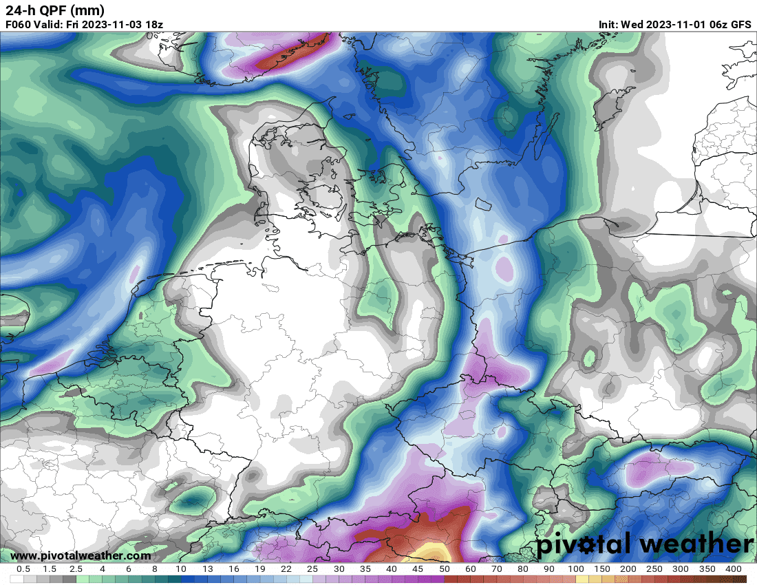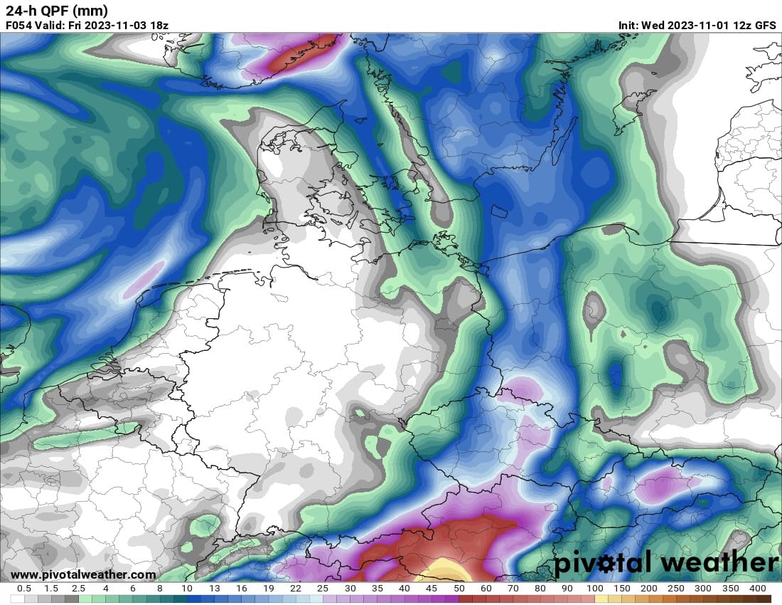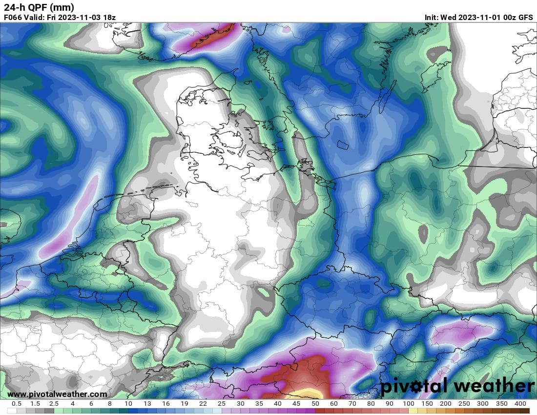 Vydatnější déšť přinese na naše území s cyklonou spojený frontální systém. Ten přejde naše území v noci na pátek a během pátku k východu. Očekává se intenzivnější a trvalejší déšť, který místy přinese vyšší úhrny srážek a rozkolísá průtoky zejména menších a středních toků. To je ovšem po dosti suchých týdnech, kdy v tocích teče stále méně vody než by v tuto dobu mělo, pozitivní vývoj a dobrá zpráva. Numerické modely samozřejmě nemají v rozložení srážek a tedy ve spadu těch výraznějších jasno. Příkladem mohou být i jednotlivé výstupy jednoho numerického modelu, hlavního globálního modelu GFS.