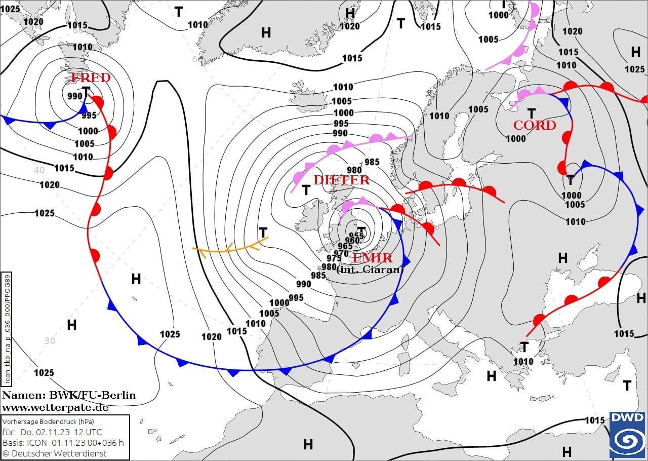 Obr. 4 Synoptická situace v Evropě 2.11.2023 13 SEČ a cykona „Emir“ nad východem Británie, zdroj: wetterpate.de