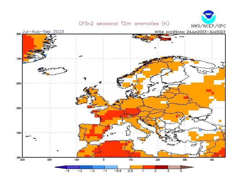 Období léta slibují klimatické modely teplotně spíše slabě až mírně nadprůměrné. Shoduje se na tom model CFS s modelem IRI. Nejen střední Evropu, ale i celý zejména jih a jihovýchod Evropy očekávají nadprůměrné. V jižní části Evropy půjde o významněji kladné odchylky. Předpověď vykazuje poměrně velkou míru jistoty. U srážek je tomu přesně naopak. Tam je odhad velmi nejistý a model IRI slibuje srážkově průměrné počasí, model CFS zatím spíše také, ale pro střední Evropu začíná předpokládat lokálně záporné srážkové odchylky.