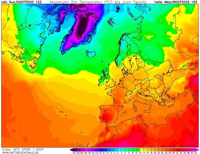 Obr. 1 Ke konci týdne čekejme až 22°C. Předpověď maxim teploty v Evropě na středu 5.10.2022, zdroj: wetterzentrale.de