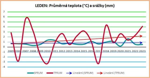 Obr. 1 Vývoj průměrné teploty a srážek s lineárními trendy v období jako celku – leden 2005-2023