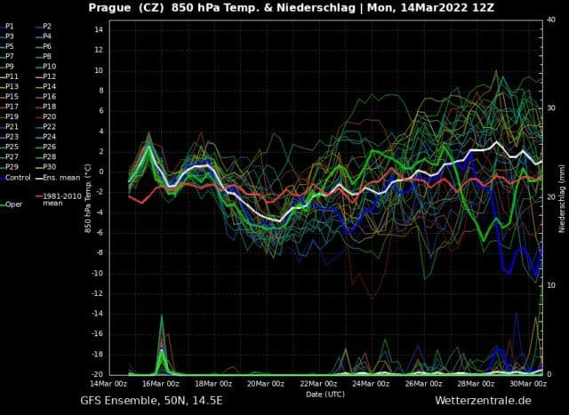 Obr. 1 Modely ochlazení mírní a oddalují. Ensemble (variantní předpověď) modelu GFS z 14.3.2022, zdroj: wetterzentrale.de