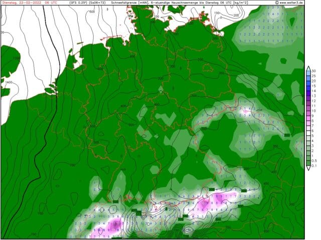 Obr. 2 Hranice sněžení na úterý 22.2.2022 ráno (kolem 300m n.m.), zdroj: wetter3.de