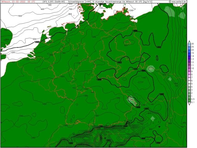Obr. 3 Hranice sněžení na středu 23.2.2022 v noci (kolem 1 000m n.m.), zdroj: wetter3.de