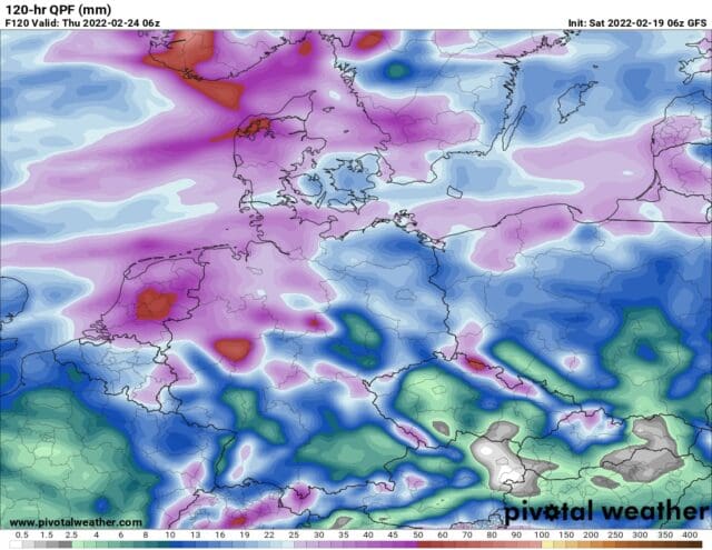 Obr. 1 Akumulace srážek do 24.2.2022 podle modelu GFS, významně vyšší srážky na horách, zdroj: pivotalweather.com