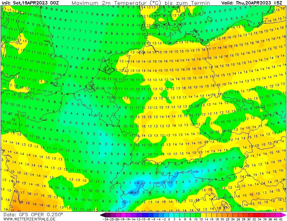 Obr. 1 Nastane příští týden oteplení? Maxima teploty na čtvrtek 20.4.2023, zdroj: wetterzentrale.de