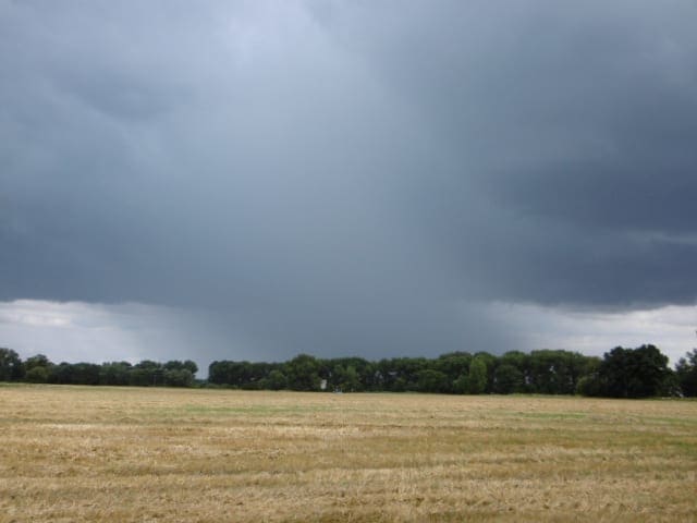 Obr. 1 a 2 Bouřky. Dobře poznáme, že z oblaku bude pršet podle srážkových pruhů. Pokud jsou tyto husté, tedy velmi zřetelné, jde o velké srážkové částice. Nebo velké množství těchto částic = srážky budou významnější, v bouřkách prudké. Bude pršet tam, kde právě jsem? Podle postupu oblaku to lze při soustavném a pečlivém pozorování odhadnout. Pakliže bouřka na obrázku 1 postupuje směrem k pozorovateli, srážky jsou jisté. pokud bouřka na obrázku 2 postupuje z pohledu situace fotky vpravo, pak místo mine a to často dosti těsně.