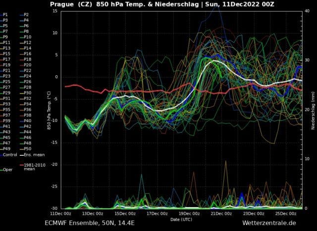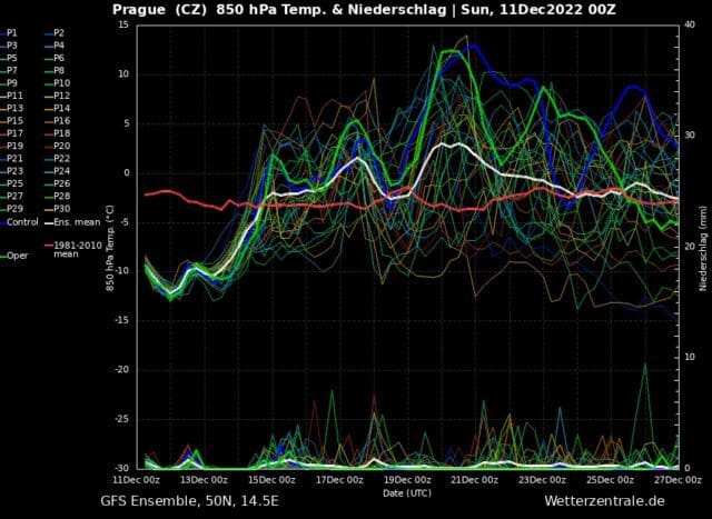 Model GFS ukazuje avizované zmírnění mrazu po polovině týdne a další oteplení v jeho závěru. Následně velmi krátké ochlazení a poté hlavní předvánoční oblevu. Během svátků pak ochlazení na hodnoty běžné pro toto období. Můžeme vidět, že křivky v podobě jednotlivých variant vývoje jsou již přibližně od čtvrtého dne předpovědi znační rozkolísané, což vykazuje velkou nejistotu předpovědi.