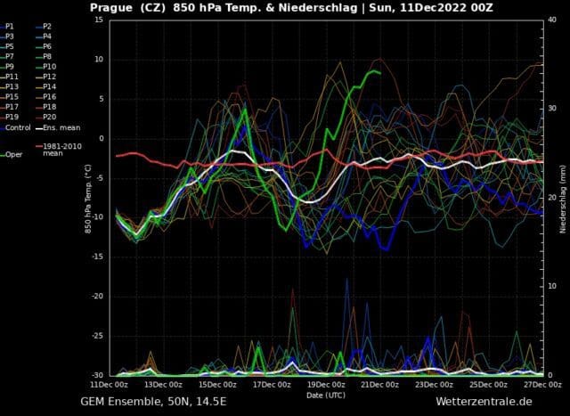 Model GEM ukazující méně variant také vykazuje od čtvrtého dne nejistotu vývoje teploty vzduchu. Oteplení slibuje ke konci týdne, ovšem zdaleka menší než model GFS. Předvánoční oteplení na počátku nového týdne prakticky neukazuje, oproti modelům GFS a ECMWF. Slibuje pouze zvýšení teploty v 850hPa na hodnoty kolem normálu či spíše slabě pod normálem.