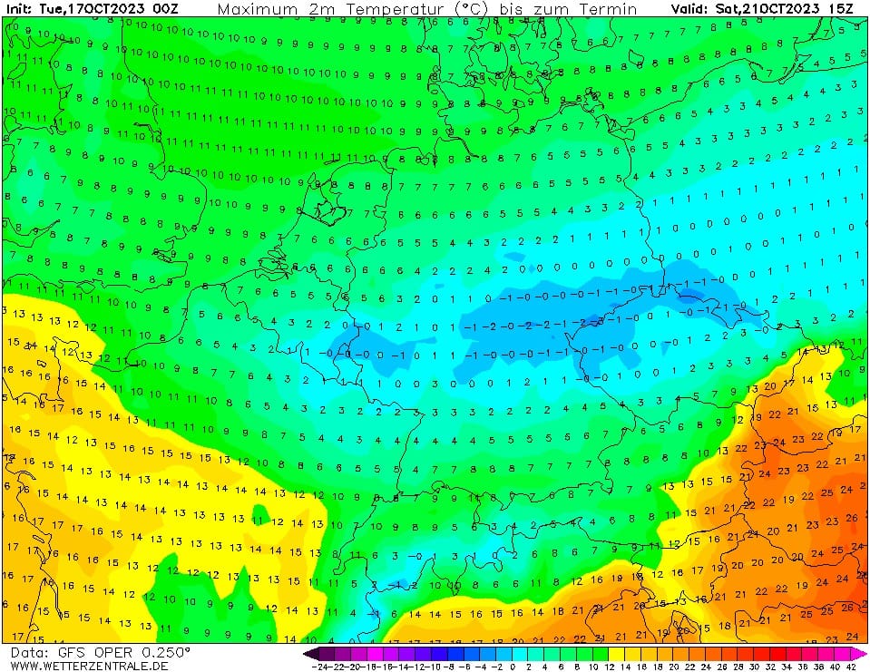 Obr. 2 Maxima teploty vzduchu na 21.10.2023 podle modelu GFS ze 17.10.2023, zdroj: wetterzentrale.de