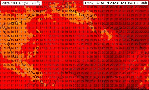 Obr. 1 Maxima teploty vzduchu na sobotu 21.10.2023 podle modelu Aladin, zdroj: chmi.cz