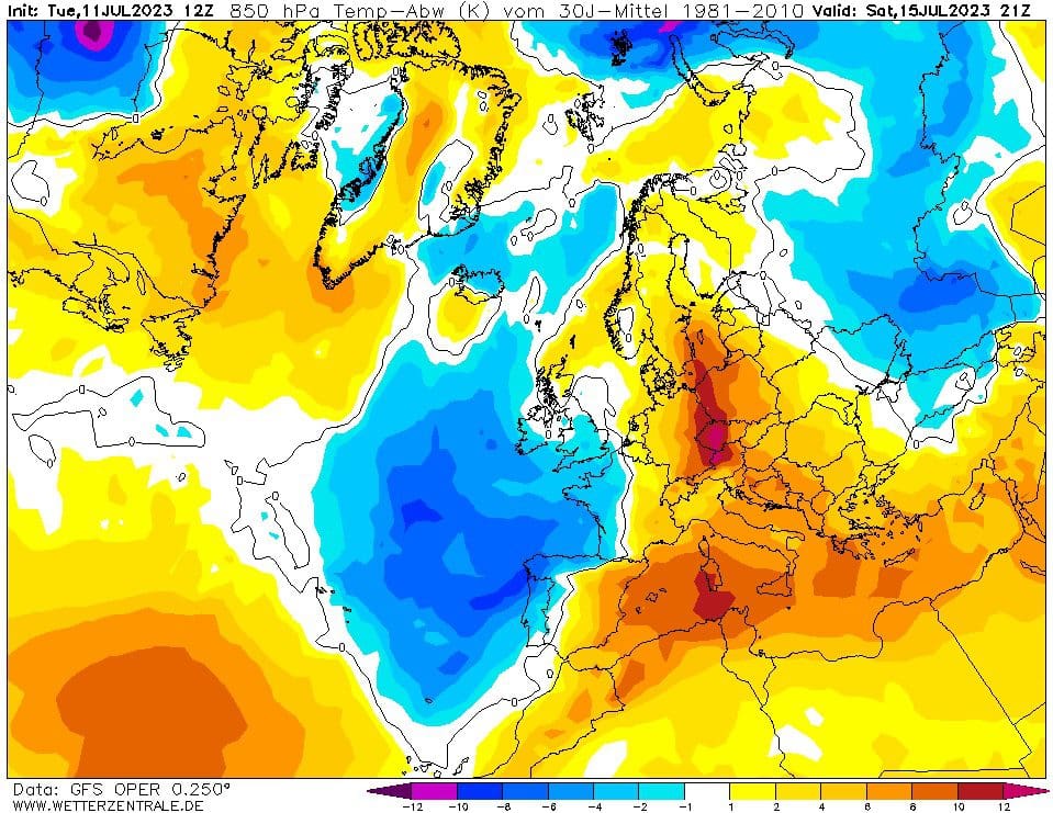 Obr. 1 Odchylky teploty vzduchu v Evropě na 15.7.2023, zdroj: wetterzentrale.de