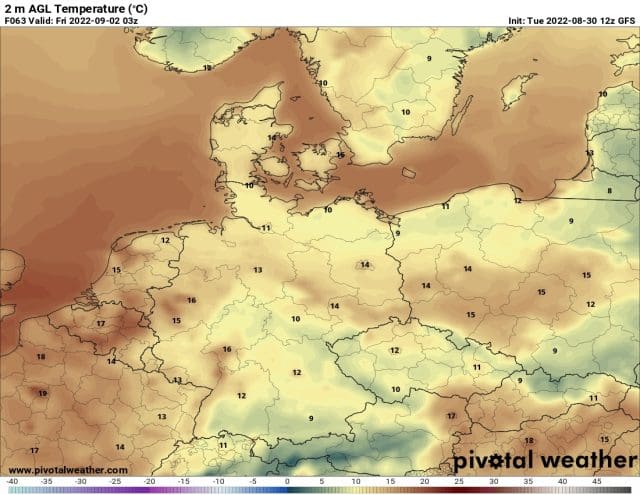 Obr. 1 Minima teploty vzduchu na pátek 2.9.2022, zdroj: pivotalweather.com