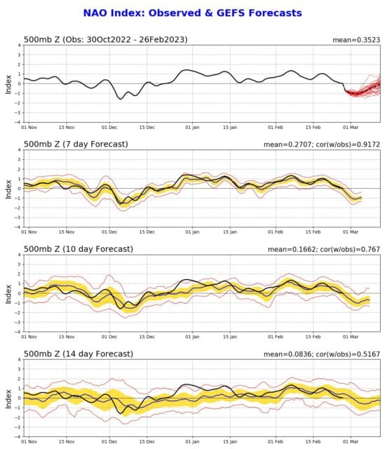 Obr. 1 Po teple typicky studený březen. Vývoj NAO indexu za poslední měsíce a jeho předpověď na dva týdny, pokles indexu pod nulu na konci února a jeho pozvolný růst k nule před polovinou měsíce března, zdroj: noaa.gov