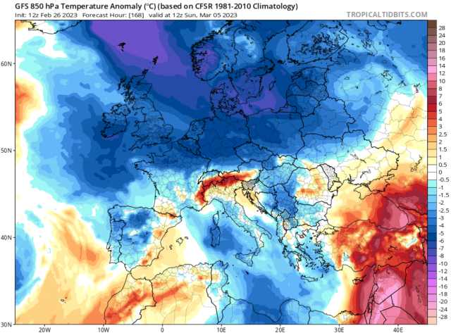 Obr. 2 Typicky studený březen. Očekávané odchylky teploty vzduchu kolem 5.3.2023, zdroj: tropicaltidbits.com
