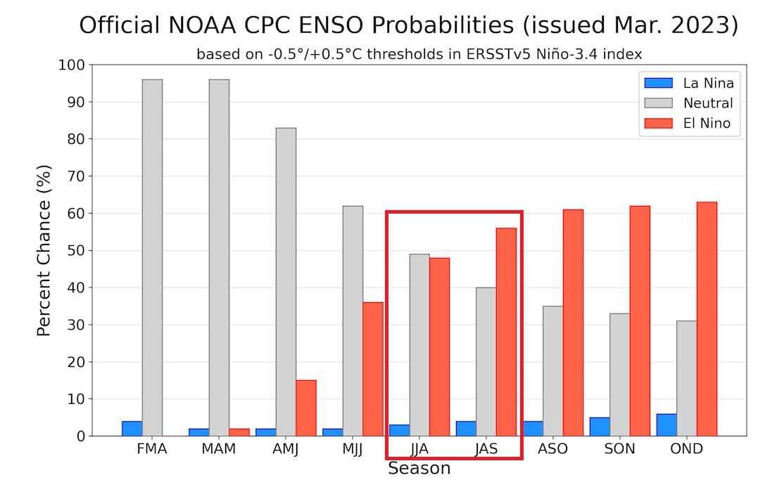 Obr. 2 Předpověď pravděpodobnosti výskytu jednotlivých fází El Niňo Souther Oscilation v roce 2023, zdroj: severe-weather.eu
