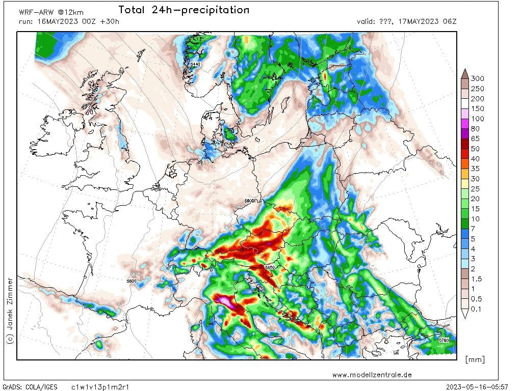 Obr. 1 Akumulace srážek za den v Evropě do 17.5.2023 8 SELČ, zdroj: modellzentrale.de