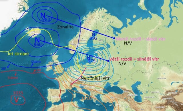 Vůči anticykloně dochází k výskytu určitého tlakového rozdílu v oblastech ležících mezi těmito útvary. Záleží na mohutnosti výše a hloubce níže na jedné straně. A na blízkosti výskytu útvarů, resp. postupu níží v severní části na straně druhé. Pokud postupuje cyklona více severně, přes sever Skandinávie nebo ještě severněji, bývá vítr ve střední Evropě slabší. Někde jde o mírně čerstvé proudění a jinde ani nijak nezesílí, jen v souvislosti s přechodem systému front. Ten si představme v oblasti cyklony například nad střední Evropou, většinou už v severní části okludovaný (vzniká tam okluzní fronta).