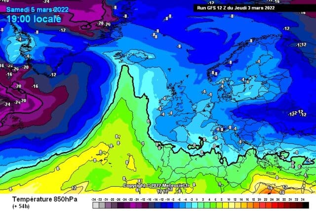 Obr. 1 Studené počasí vydrží dlouho. Předpověď teploty vzduchu v 850hPa na 5.3.2022 podle modelu GFS, zdroj: meteociel.fr