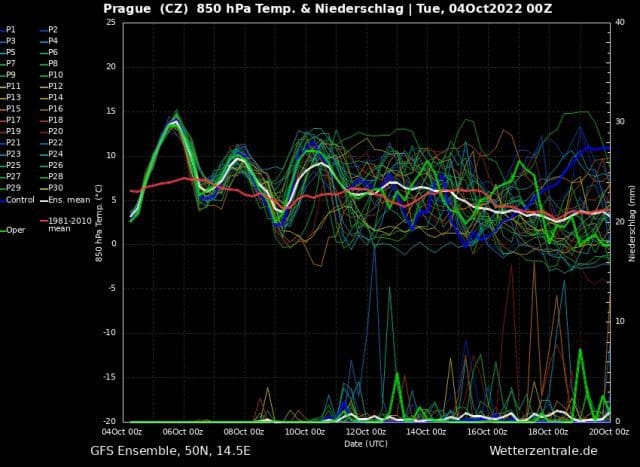 Obr. 1 Teplejší počasí vydrží do pondělí. Ensemble modelu GFS a vývoj teploty vzduchu v 850hPa a atmosférických srážek, zdroj: wetterzentrale.de