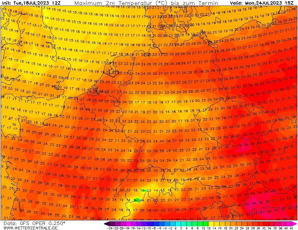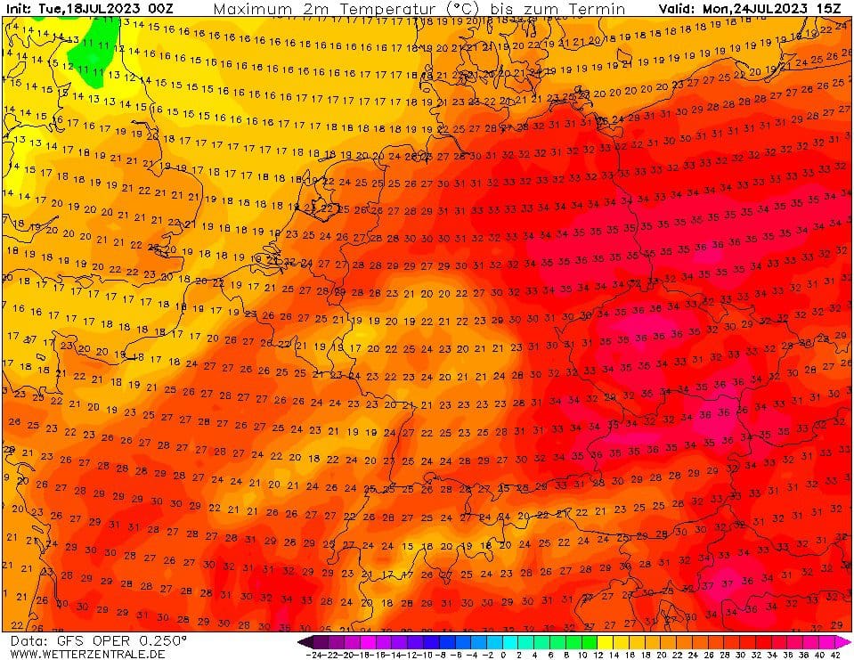 Obr. 2 Tropické počasí opět o víkendu. Maxima teploty na 24.7.2023 podle modelu GFS z 18.7.2023 12h, zdroj: wetterzentrale.de