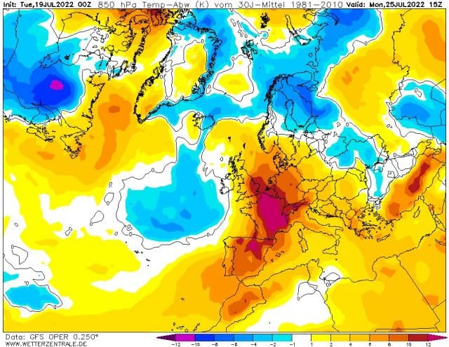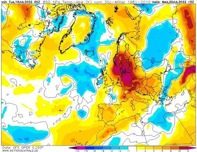 Obr. 1 Odchylky teploty vzduchu na 20.7.2022 dle modelu GFS, zdroj: wetterzentrale.de