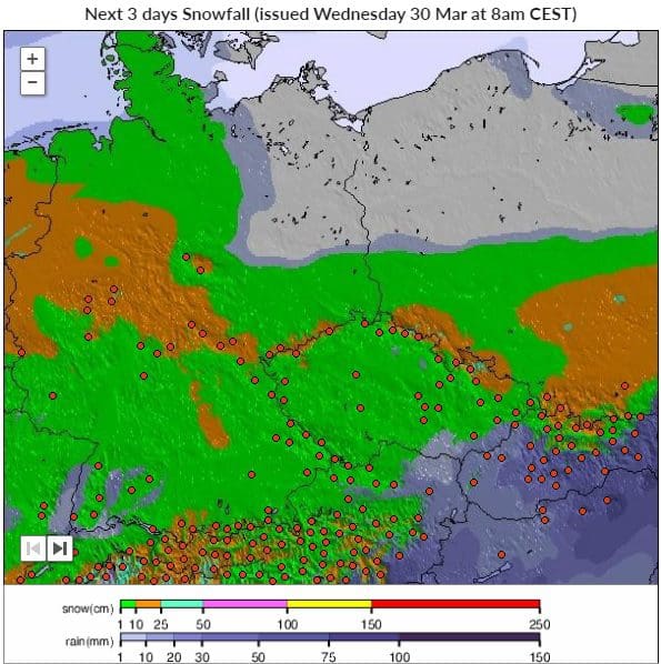 Obr. 1 V nížinách napadne sníh. Sněhové srážky do 2.4.2022, zdroj: snow-forecast.com