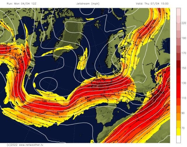 Obr. 1 Ve čtvrtek nárazy větru 90km/h. Předpověď polohy jet streamu na čtvrtek 7.4.2022, zdroj: netweather.tv
