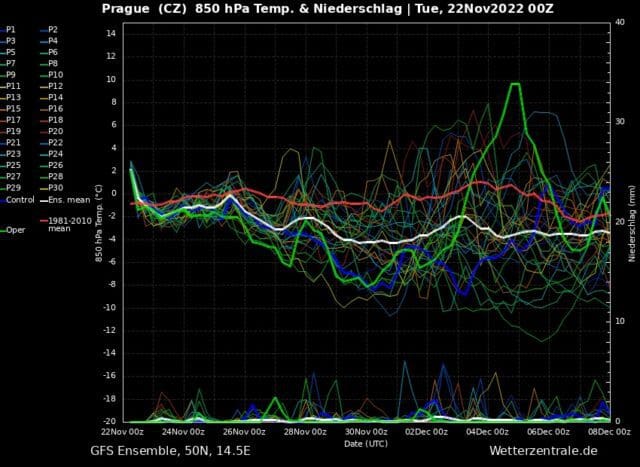 Obr. 1 Žádné velké teplo ani zima. Ensemble modelu GFS na další dva týdny – průměrná teplota v hladině 850hP a srážky, zdroj: wetterzentrale.de.
