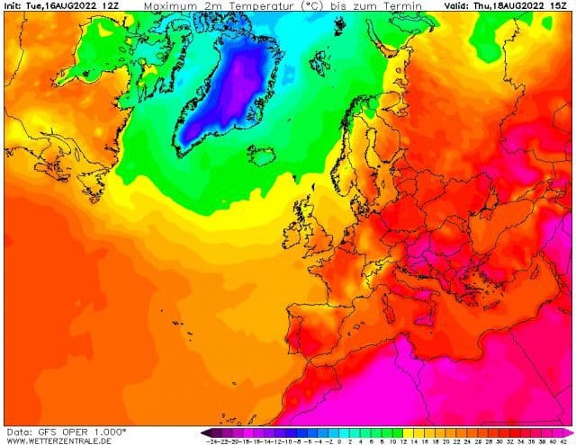 Obr. 1 Zítra 35°C a víkend letní. Očekávaná maxima teploty vzduchu v Evropě na 18.8.2022, zdroj: wetterzentrale.de